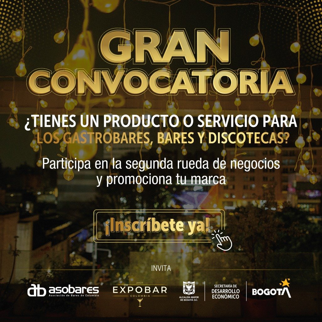 La Asociación de Bares de Colombia – Asobares, tiene el gusto de invitarlo a participar en la segunda convocatoria de emprendimientos que, en alianza con Desarrollo Económico Bogotá , busca 20 emprendedores cuyo servicio o producto esté dirigido a bares,  restaurante, gastrobares y discotecas para que sean parte de la muestra comercial de nuestro evento #Expobar2021 el próximo 30 nov y 1 dic .