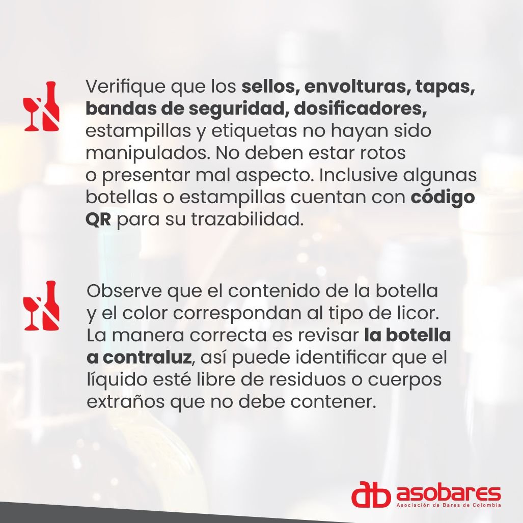🥂Verifique que los sellos, envolturas, tapas, bandas de seguridad, dosificadores, estampillas y etiquetas no hayan sido manipulados. No deben estar rotos o presentar mal aspecto. Inclusive algunas botellas o estampillas cuentan con código QR para su trazabilidad.