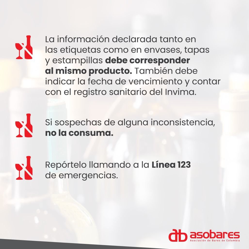 🥂La información declarada tanto en las etiquetas como en envases, tapas y estampillas debe corresponder al mismo producto. También debe indicar la fecha de vencimiento y contar con el registro sanitario del Invima.