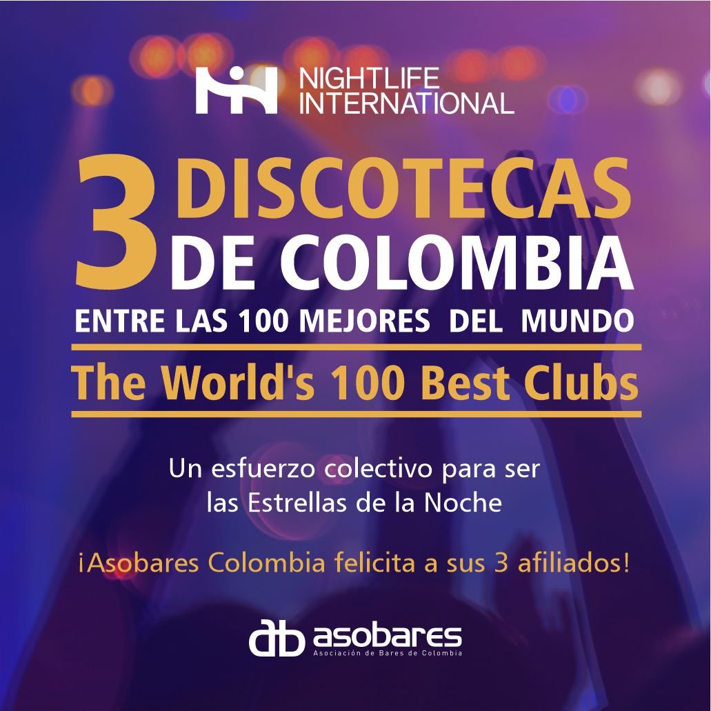 Asobares Colombia, como Asociación afiliada a la International Nightlife Association (I.N.A.), se complace y siente orgullosa como gremio en Colombia, que tres (3) de sus afiliados en el país, ingresen a la prestigiosa lista de los 100 mejores clubes del mundo.